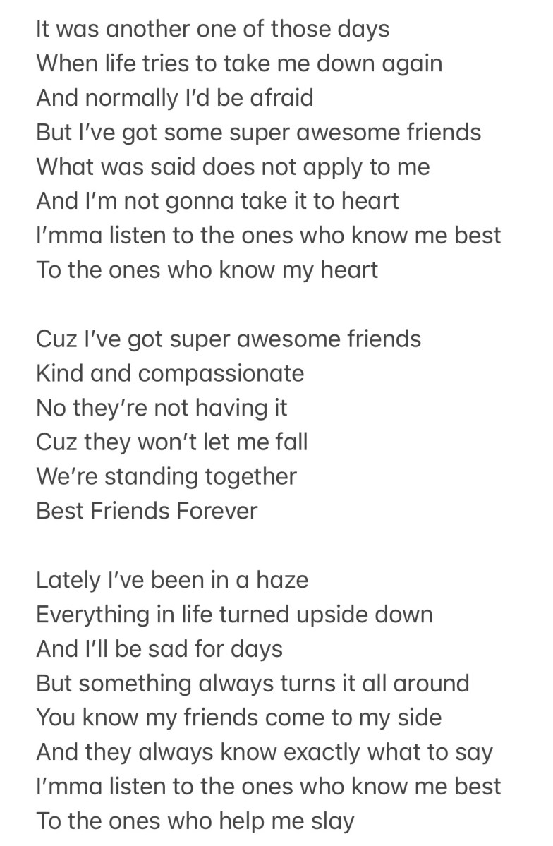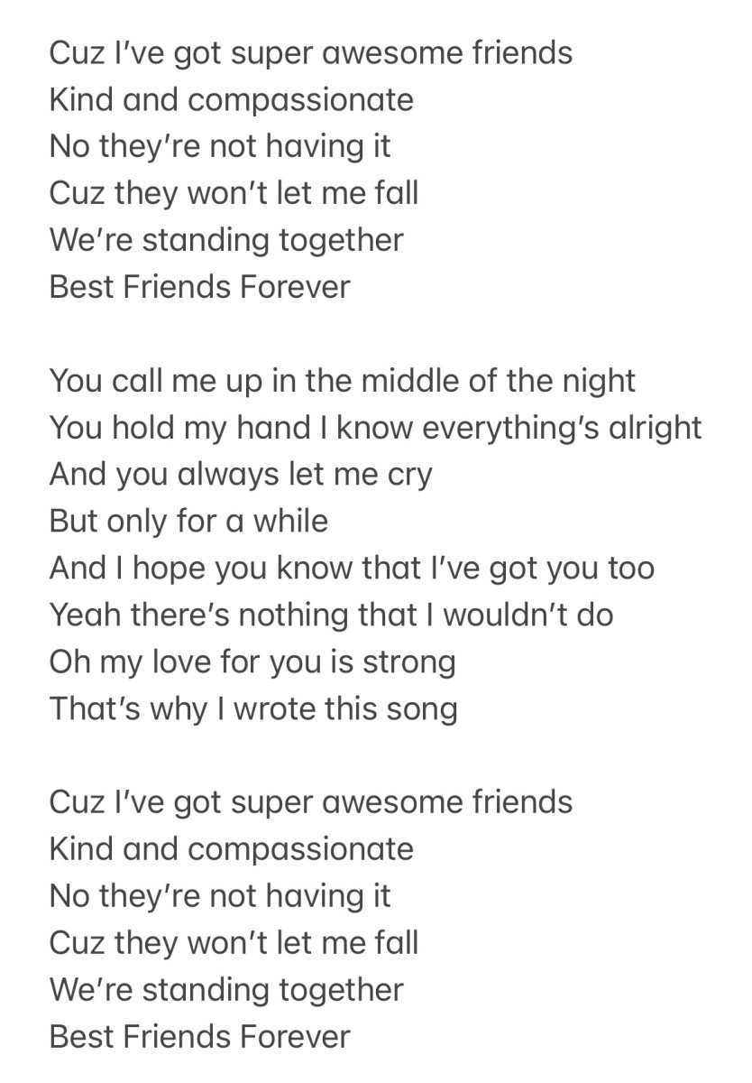 So I wrote a song for all my friends today. The song is kind of self explanatory. I’m going through some stuff that is hard but I have so many amazing friends who are helping me through it. I love them so much. I want them to know I think they’re just the absolute best in this world. And, also, I’m putting these shitty experiences on notice. They might try to take me down but they won’t be able to because my super awesome friends have my back.