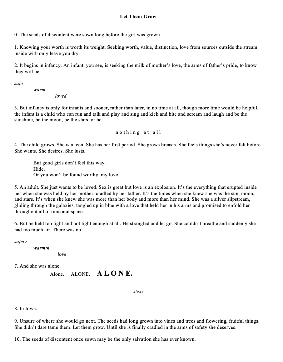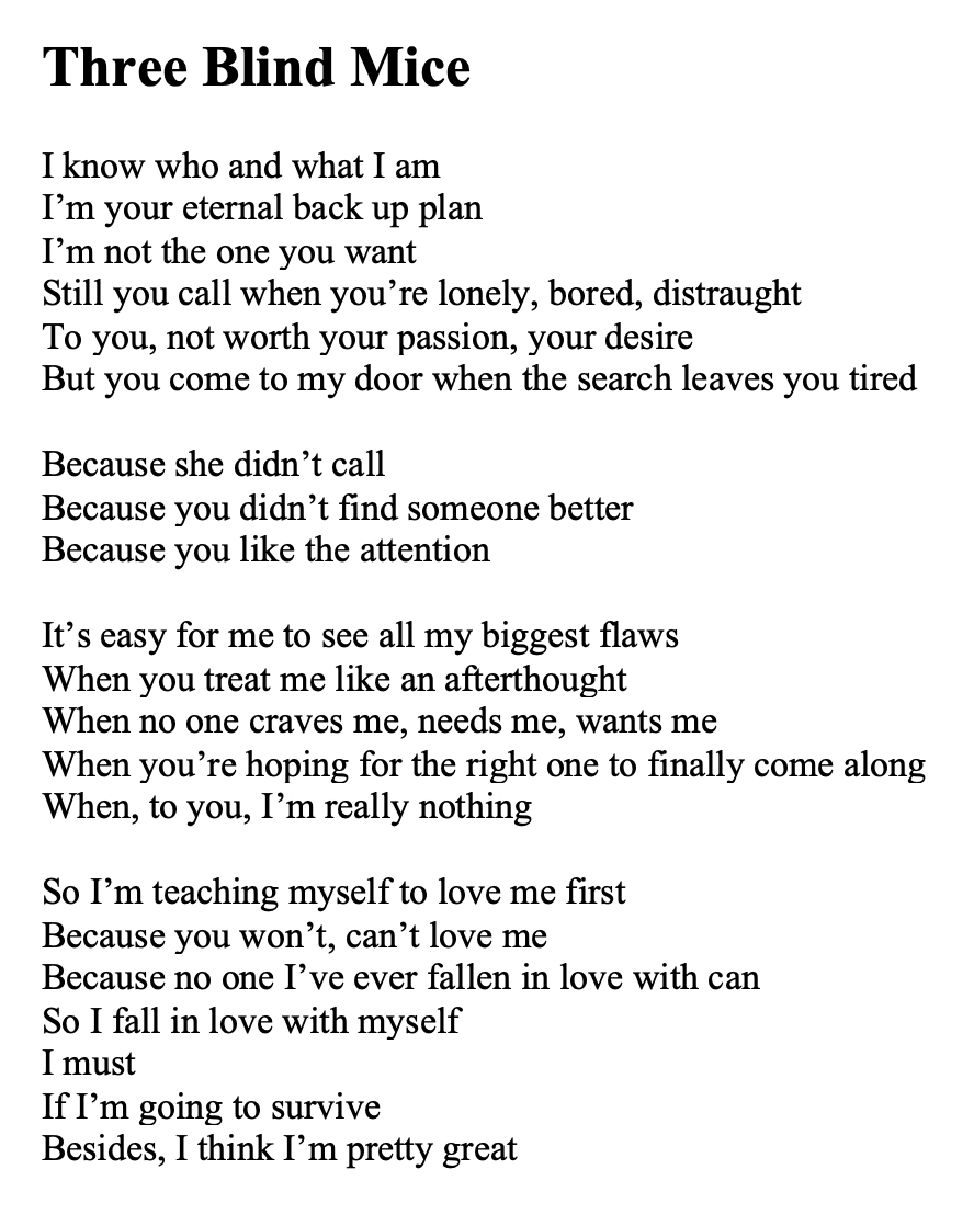 Feeling my feelings today. It’s ok to do that. Getting out the junk inside me and airing it out in the open sometimes helps. Like pulling a sticky, inky string of infected pus from out of my soul, washing it in a rain barrel, and hanging it out on grandma’s clothesline. So, in order to achieve this feat, here are 3 more of my recent poems. The editing software for this site doesn’t allow me to create the kind of line breaks I want in my poetry or song lyrics so I always just take screenshots of them in Word and post the screenshots here. I mention this because I worry the screenshots may look as though the whole thing is one big poem. I tried to separate them out a bit for you but in case it’s not clear, the poems are Three Blind Mice, And being burned alive, and Let Them Grow. Not really looking for comments on these, thanks. Just feeling my feelings today.